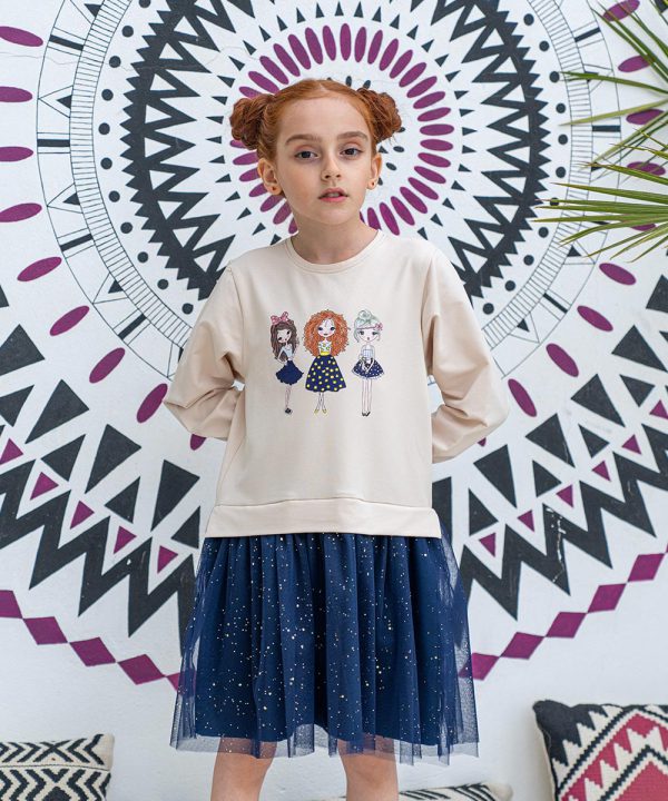 پیراهن کرم پورتو دامن تور سرمهای